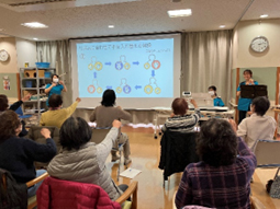 サロン実施後に行うアンケートでも関心の高いテーマである認知症予防についてクイズを交えながら勉強をしました。後半はコグニサイズ(運動と認知課題を組み合わせたもの)を一緒に行い、終始笑い声が絶えない素敵な回となりました。この日は、当院スタッフによるミニコンサートも行われ、入院患者様も交え一緒に演奏しました。